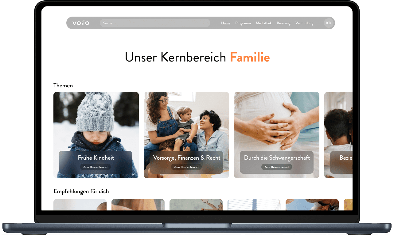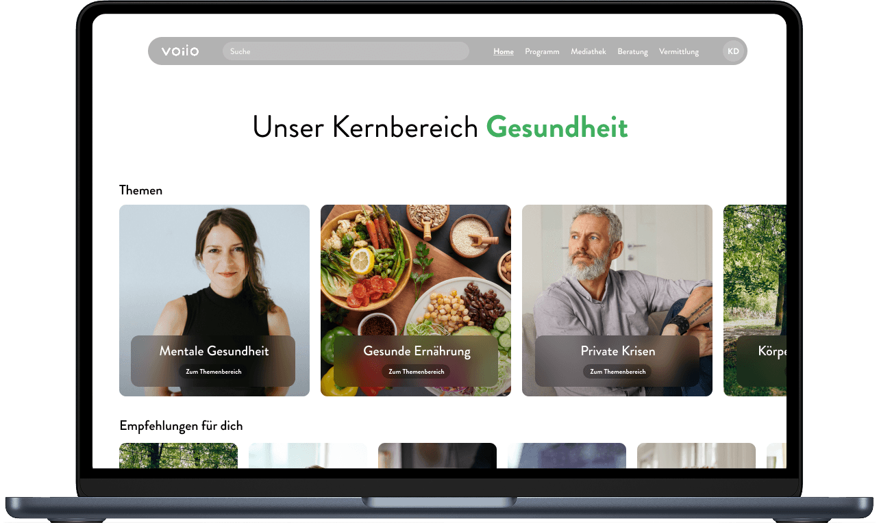 voiio bietet ganzheitliche Unterstützung in den Bereichen Gesundheit, Familie und Arbeit an. Denn wir glauben, dass diese den größten Einfluss auf das Stressempfinden und den Umgang mit täglichen Herausforderungen haben. Deshalb stehen sie bei uns im Mittelpunkt.